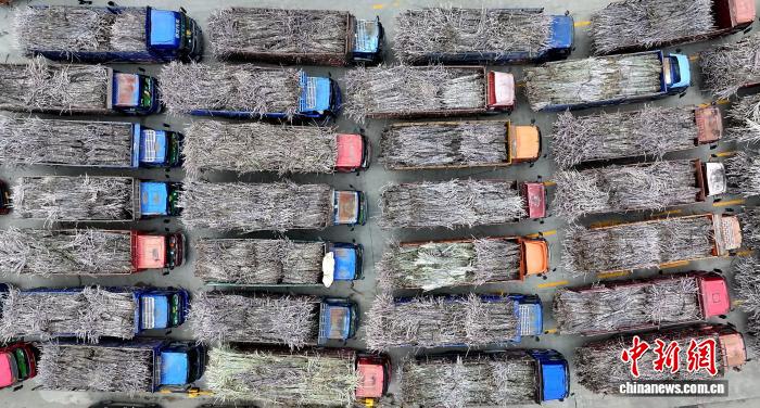 图为正在柳乡糖厂,运蔗车期待入进工场。(无人机相片) 汤晓逵 摄