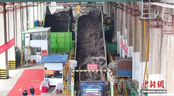 图为正在凤山糖厂,运蔗车将苦蔗倒进蔗槽。汤晓逵 摄